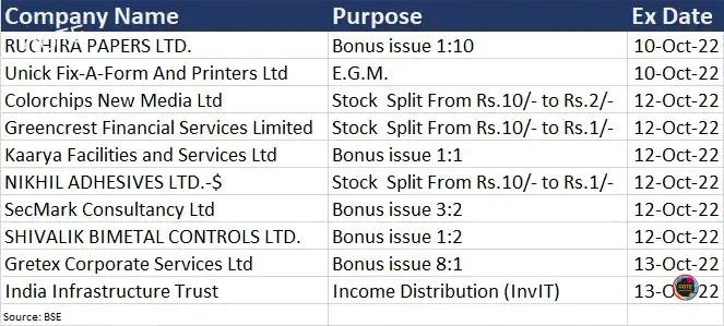 Next week will see the start of the ex-bonus trading period for Ruchira Papers, Kaarya Facilities and Services, SecMark Consultancy, Shivalik Bimetal Controls, and Gretex Corporate Services. The ex-split trading period will begin for Colorchips New Media, Greencrest Financial Services, and Nikhil Adhesives shares.